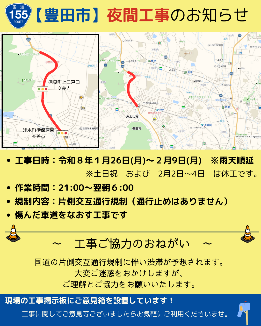 令和8年1月26日より国道155号(豊田市保見町)で夜間片側交互通行規制を行います。