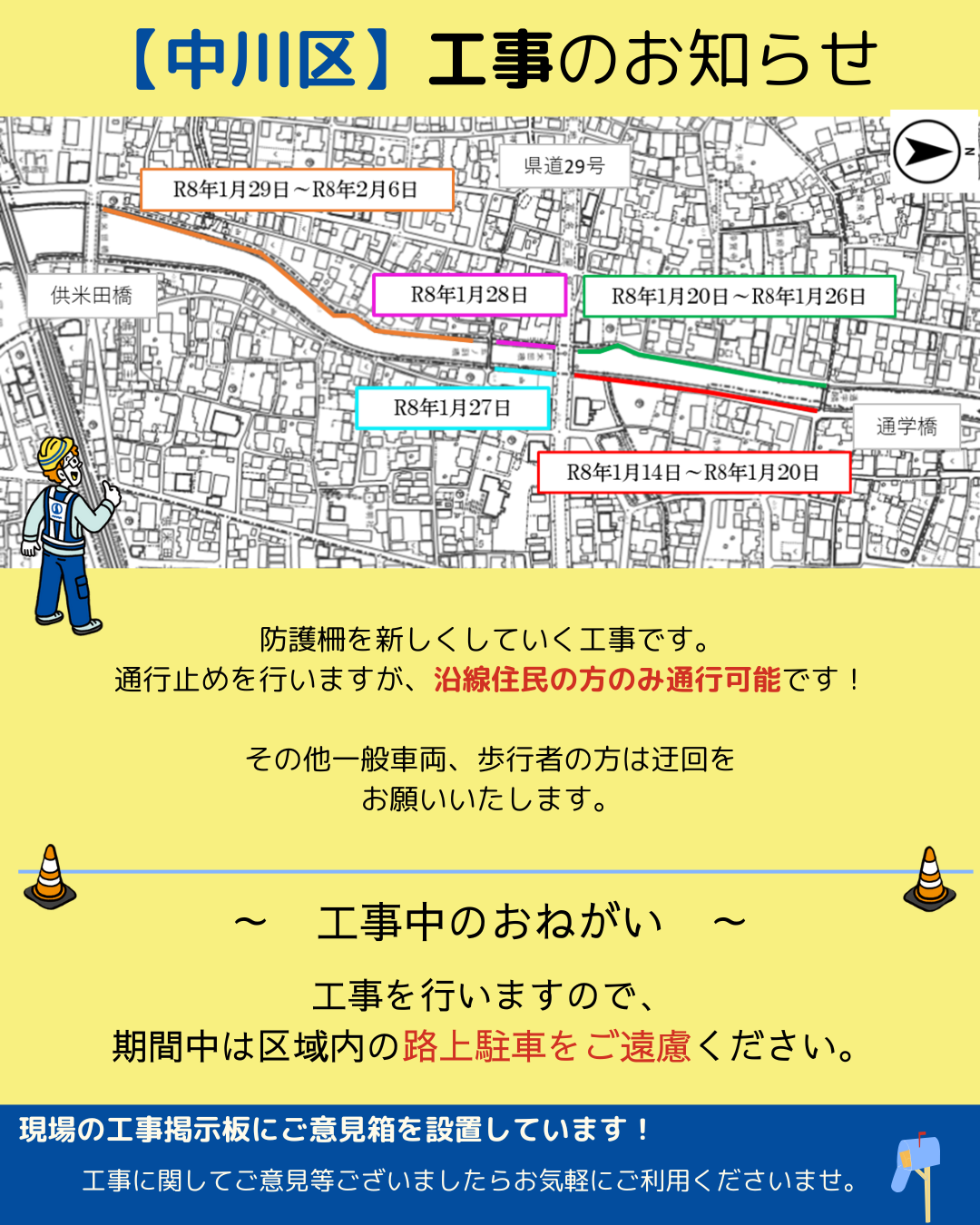 令和8年1月中旬より名古屋市中川区で防護柵工事を行います。